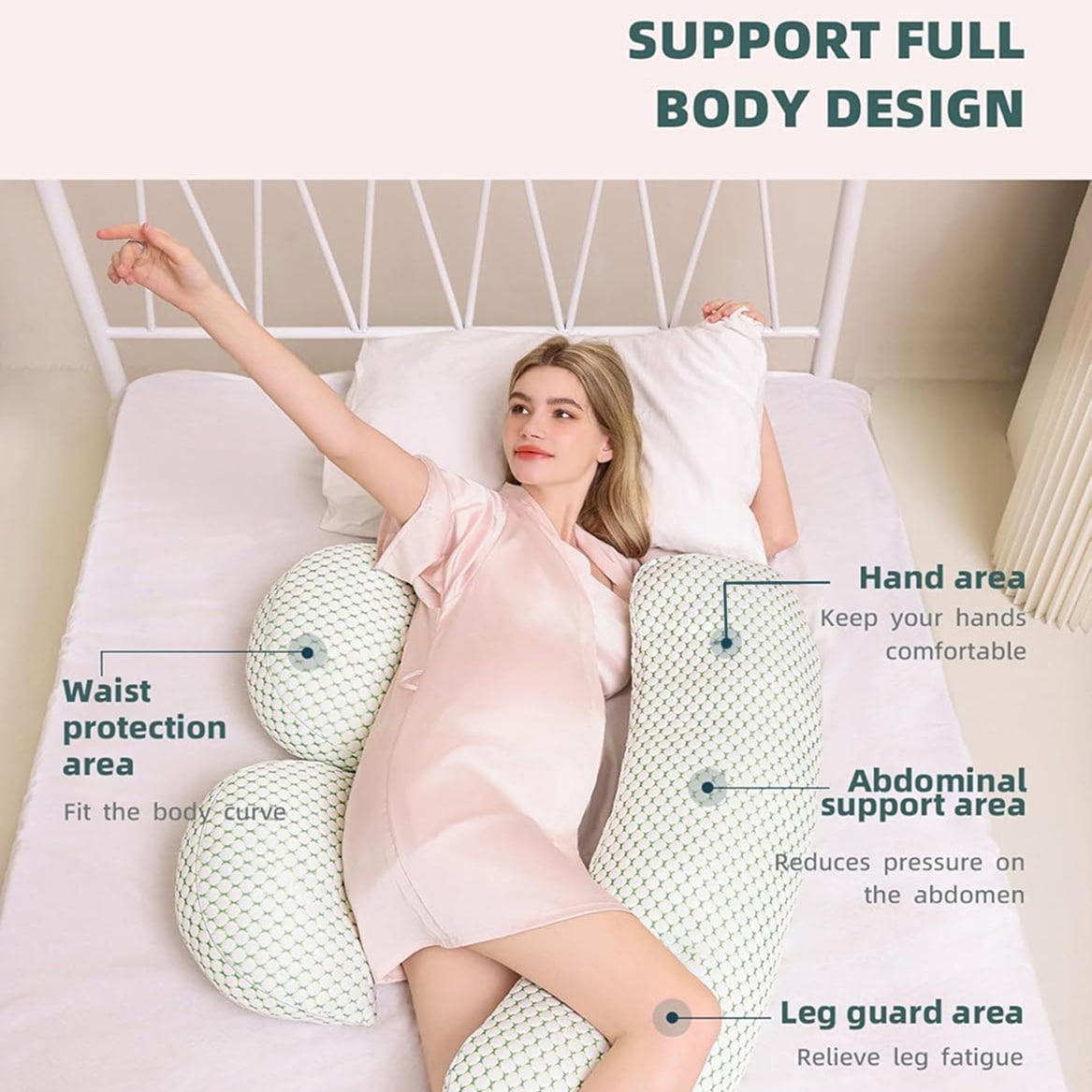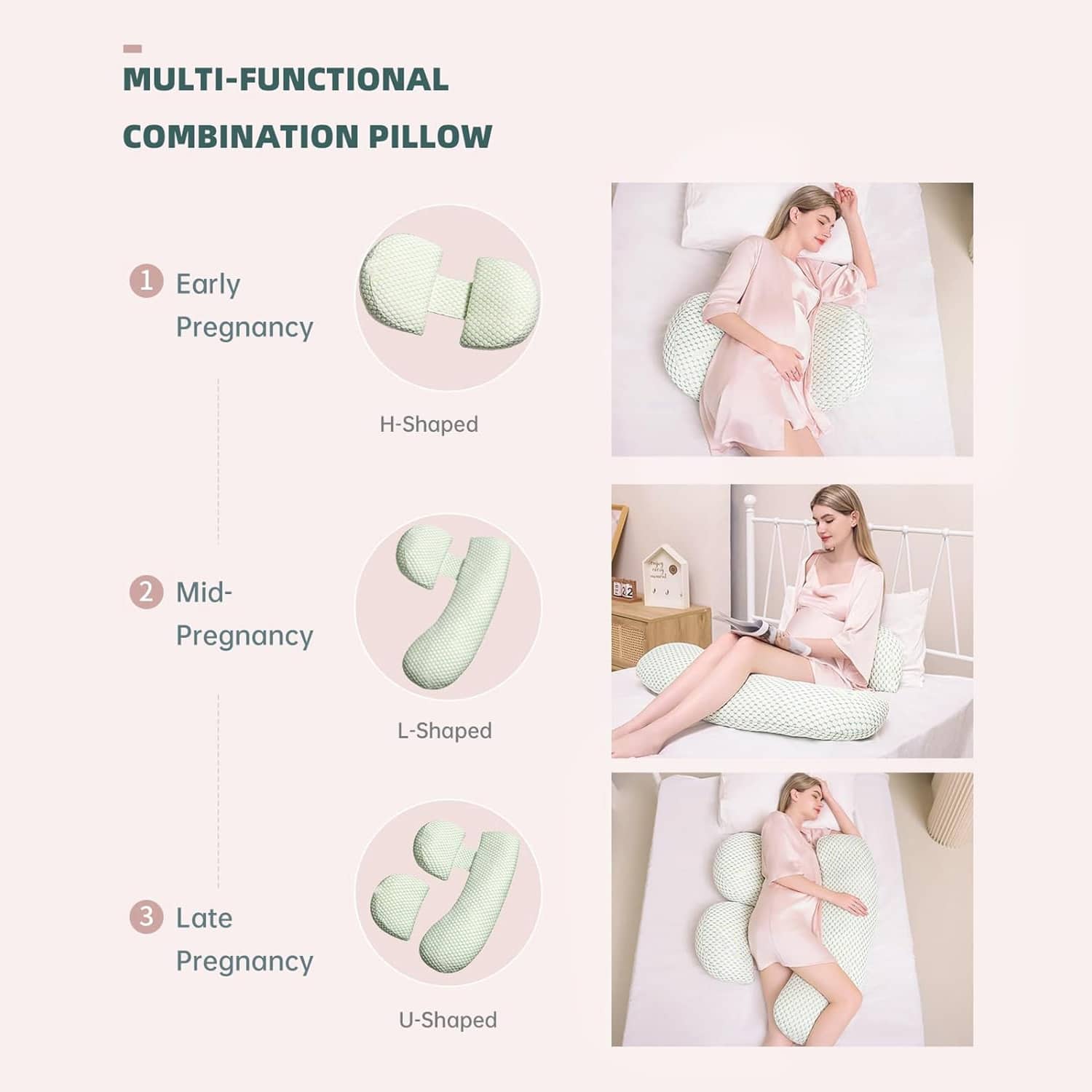 • Adjustable spacing between pillows accommodates your growing belly size