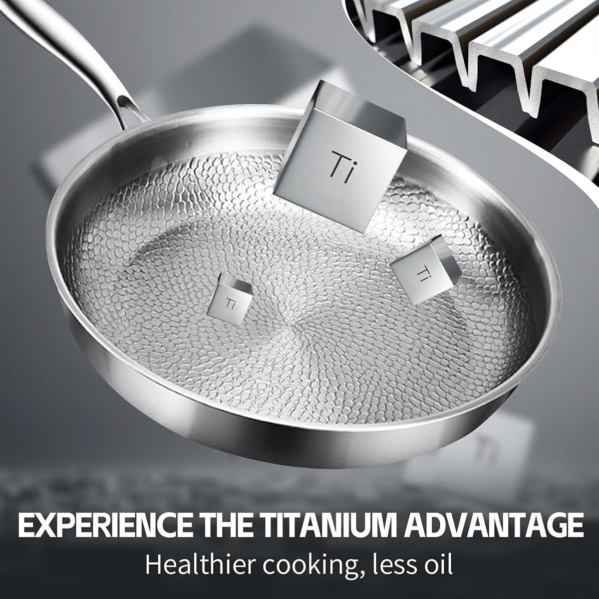 Hammered titanium surface creates natural non-stick properties without chemicals