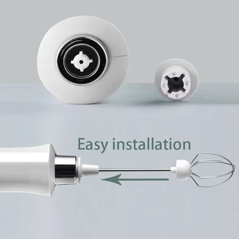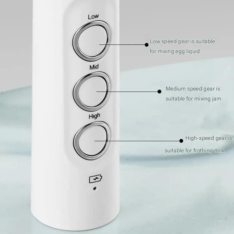 Detach the mixing head and rinse under warm water immediately after use. For thorough cleaning, use mild dish soap and a soft brush. Note: Never submerge the motorized handle in water or dishwasher.